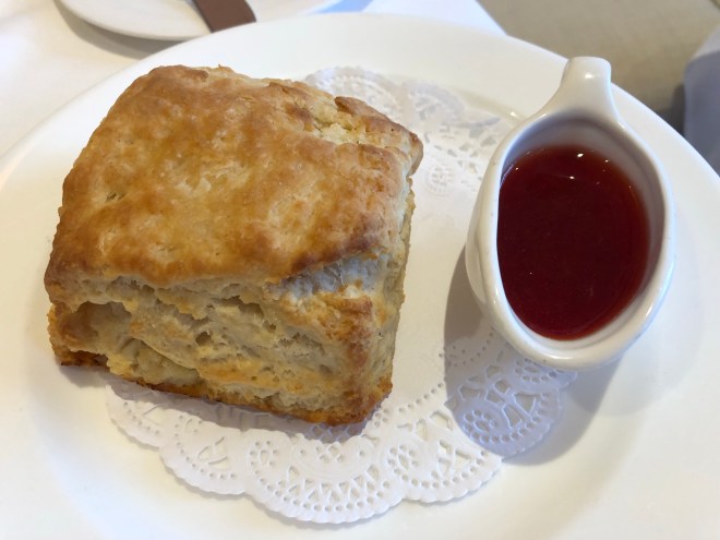 I had told Jenny breakfast was at 10:00, so there was some opportunity for her to sleep in in the morning. We were out the door by 9:45, with just the right amount of time to walk the eight blocks to Brennan’s. Brennan’s is a New Orleans institution-it ranks up there with Gallitores, Commanders Palace and Antoine’s. Jenny and I were showed to a lovely table where we proceeded to have a scrumptious breakfast-French press coffee along with Eggs Benedict for Jenny and for me a very decadent Eggs Soldour (creamed spinach topped with a slightly crunchy artichoke heart, topped with a poached egg and finished off with a creole hollandaise), with a delicious house made biscuit and jam for desert!