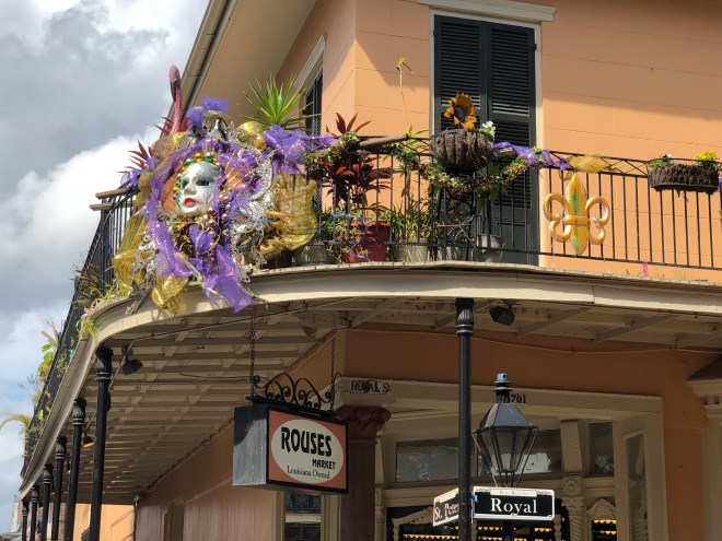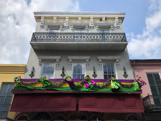 Jenny and I walked on, enjoying that the crowds of people had thinned out but in keeping aware of our surroundings there were still plenty of people about. It was fun to see so many buildings decorated up for Mardi Gras (Fat Tuesday was three days ago), including the trees shining with their bounty of beads hanging.