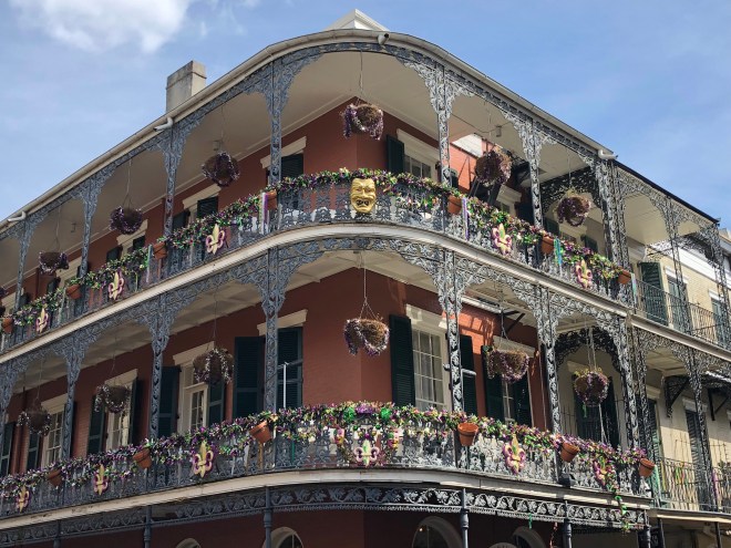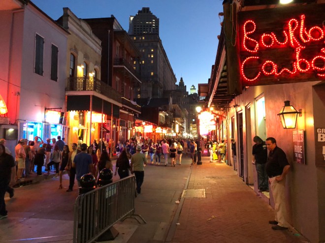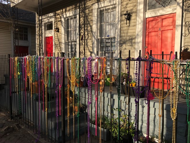 As we exited the building, there was a marching band going down Bourbon Street with masses of people following along. Turning to go back the other way (keeping with my plan to avoid Bourbon Street in the evening), I noticed far far fewer people. Hearing the words of the woman from earlier in the park office in my head, I told Jenny we were headed into the debauchery that is Bourbon street to get back to the hotel. Of course we literally just turned the corner and some girl is flashing herself to receive the beads that are literally hanging off every street sign, wrapped around every pole and dangling from every fence post and tree branch. Oh well-so much for well intended plans-I suppose the old adages are smart to live by-better safe than sorry, safety in numbers and don’t do like the fools do!
