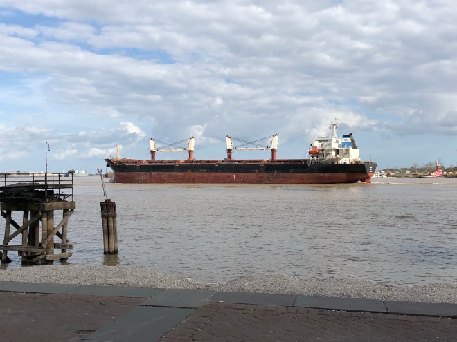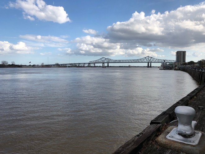 Having had enough of the throngs of people we decided to walk over to the river and make our way along the river walk back towards the hotel. Once up on the levee, the breeze was so refreshing we took a seat and just enjoyed watching the paddle boats and barges moving up and down the river. The spot was also great for people watching-there are certainly some characters in this city!