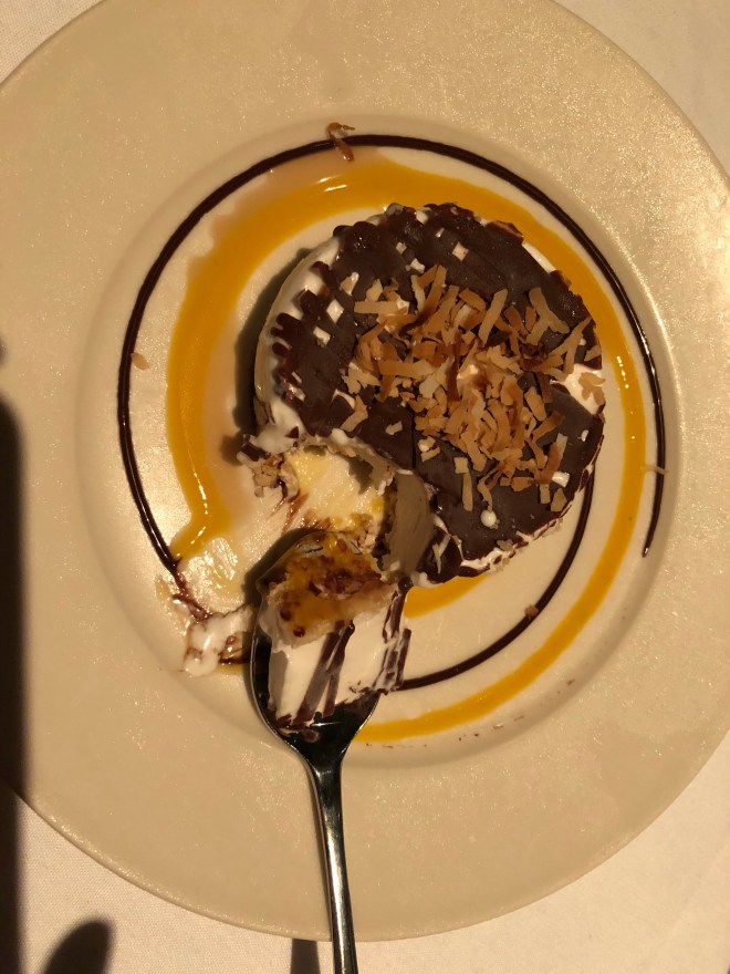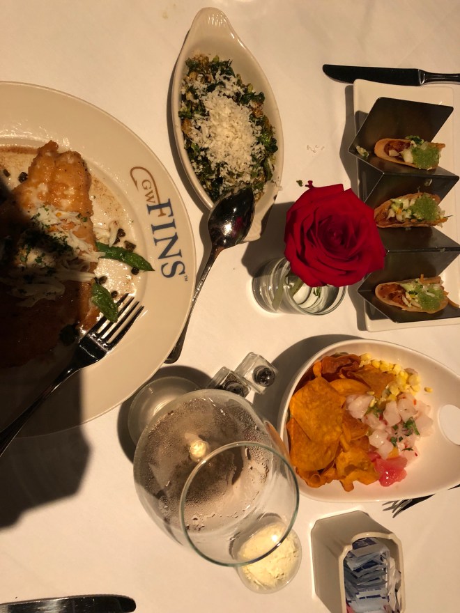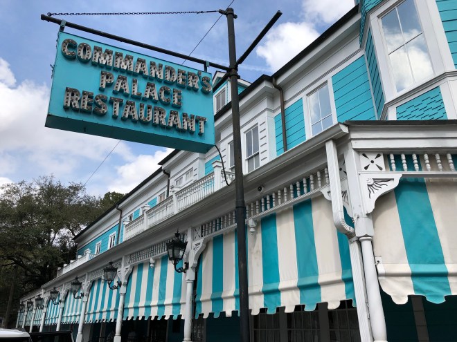 Back at the hotel we relaxed for an hour or so before heading out to dinner. Dinner tonight was at GW Fins-the #1 rated restaurant on Trip Advisor and boy did it not disappoint. Our dinners were amazing! Jenny opted for three appetizers-tuna crudo, tuna tacos and red snapper ceviche. I had a shrimp salad with fried green tomatoes and a parmesan crusted speckled trout. We both ate every bite and when it came time for dessert I thought I was going to pass until Jenny insisted I didn’t and said we had walked four plus miles today so it was OK. Well, I am glad I didn’t because I ended up eating every bite of my coconut samoa as did Jenny with her salted caramel ice cream pie-wow, wow, wow!