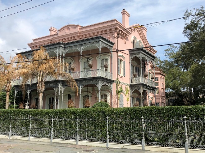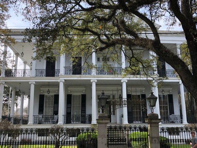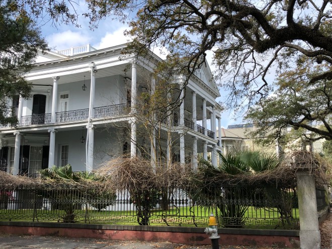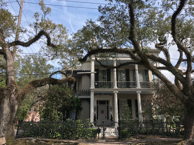 The ride along St. Charles was pleasant, with the refreshing breeze keeping things comfortable and the unique setting passing by. I had decided we would get off at Jackson Street to go and see Buckner mansion, a home that has been used in, among other shows, American Horror Story. Buckner mansion was built in 1856 by the cotton kingpin Henry S Buckner, who happens to be my 3rd cousin five times removed (we both descend from my 7th great grandfather). It is an opulent mansion and was built to compete with Buckner’s ex-partner, Stanton, that had the most luxurious mansion of the time in Natchez.