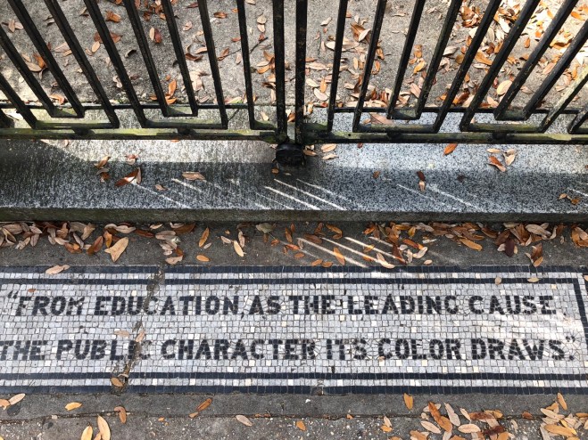 In hindsight, it seemed rather apropos to be getting an education at this time, as yesterday when Jenny and I were standing at the gates to the Buckner Mansion, I looked down and noticed part of a black and white tile mosaic covered by leaves. Brushing the leaves aside revealed a quote by the 18th century English poet William Cowper that has resonated with me since, “From education as the leading cause, the public character its color draws.” Hmmmm….