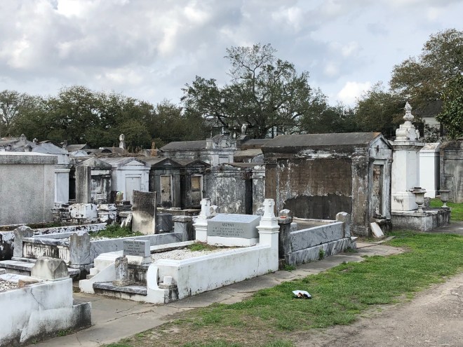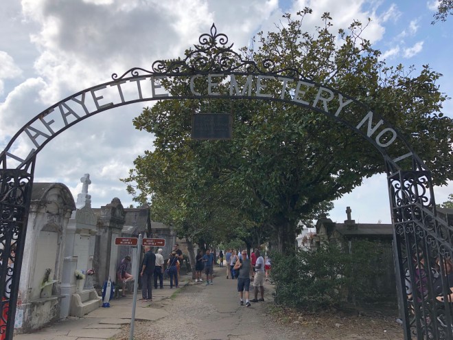 At one point, we happened upon the famed Commander’s Palace-a teal and white painted building with matching striped awnings, as the well-heeled were arriving for Sunday brunch. Across the street was Lafayette Cemetery, the oldest municipally owned cemetery with roughly 7,000 dead in its one city block. The cemetery is non-denominational and non-segregated and still has burials taking place today. We decided to go and walk among those eternally resting, admiring the ornate tombs, all of which are above ground and may contain up to 30 family members in one tomb. We recognized a few last names-Kemp and Phelps and wondered where, if anywhere, on our family trees they might be.