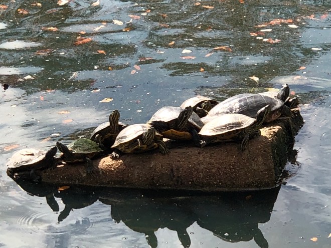 We enjoyed walking along the shady paths under the huge live oak trees and over to one of the ponds. There were hundreds of ducks-not too sure what kind and at least twenty turtles, some swimming, some sunning themselves on a rock. Jenny got a kick out of all the turtles so we stayed a while to watch them.