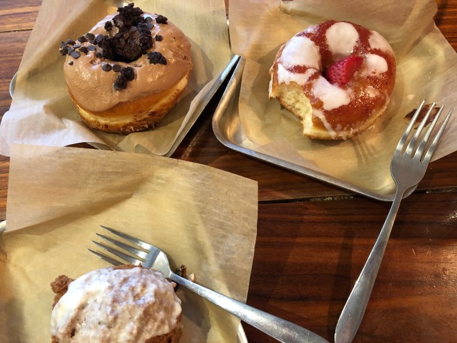 After being amused by the pug, horses and an additional dog who ran around and around in the fountain playing stay away from his owner, Jenny and I decided to find the donut shop we had heard was so good. We hopped back on the streetcar and exited a few stops down, walking back through the Garden District to Magazine Street, where we found District Donuts. The restaurant was hip inside with a warehouse vibe and furnishings made from reclaimed wood and metal. We ordered up three donuts to try, strawberry lemonade, brown butter drop (really an oversized donut hole) and brownie batter-Jenny enjoyed them more than I did. We decided that the donuts in Charleston and ones we recently had in New Haven far exceeded these.
