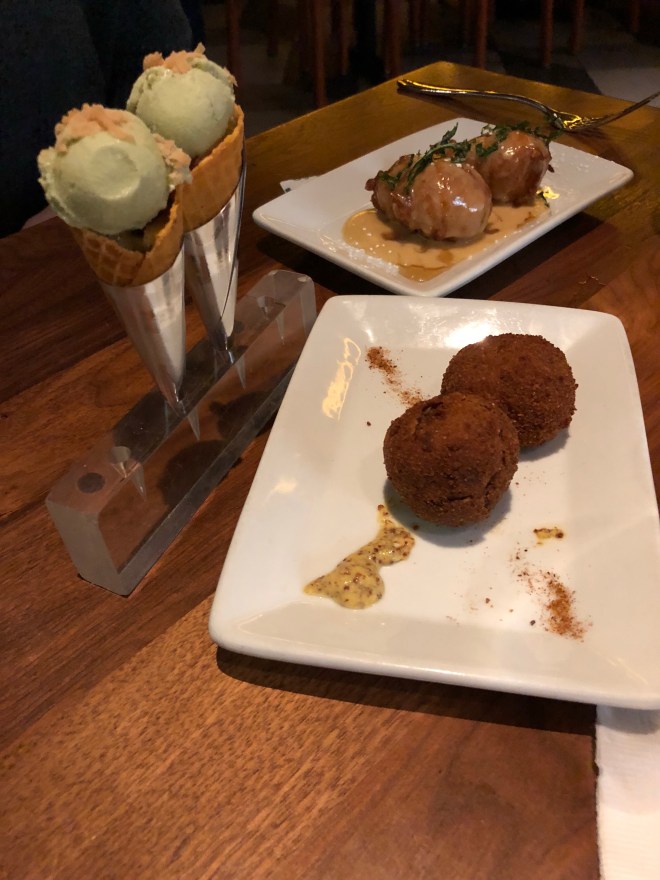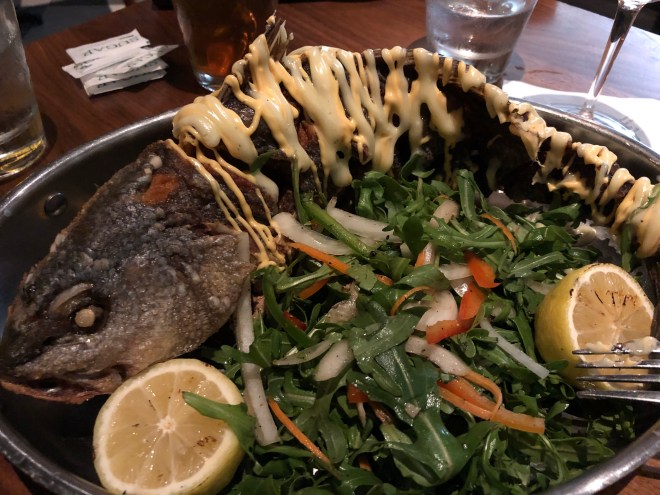 Dinner tonight was unfortunately not anywhere as good as the night before. The service was completely nonexistent for the first 20 minutes after being seated (though they did apologize profusely as well as give us an additional appetizer and comp us a dessert). The menu was almost so avant-garde that you were really wondering what it was you had just ordered. The food was really just OK. Jenny and I opted to split a whole deep fried fish-a new experience for her but a dish that is common to the South. She was a bit surprised it arrived with its head and eyeballs still attached though she was game to eat it and actually enjoyed it.