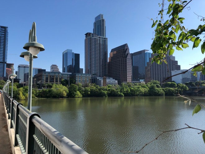 Austin, the capital of the Lone Star State is a booming area known for its music and food scene. Except for driving through Texas and flying in and out of DFW dozens of times, Jenny and I haven’t been here (Billy of course has many times), so we chose Austin as another one of our long weekend, get-to-know-the-US, destinations. Up until the day we arrived, Austin had seen a deluge of rain, up to 5 inches in 24 hours, but the weather had moved on for our arrival. We awoke to bluebird skies, dry air with a slight chill in the air and a steady breeze-our favorite conditions. Our hotel is located on the banks of the Colorado River and Lady Bird Lake, so we walked along the foot trail and crossed the River to the downtown area to go have breakfast at a spot Billy had selected.
