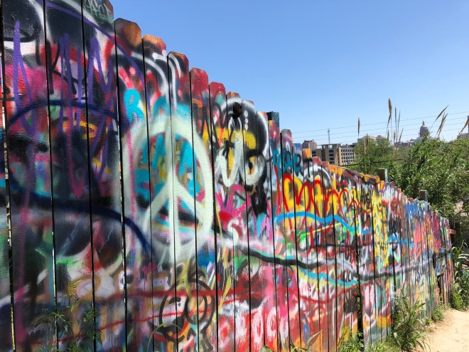 Hope Outdoor Gallery is really nothing more now than a tiered graffiti park found on the remnant foundations of a hillside complex of some sort. At one time, it was an actual gallery of murals done by local artists but since the announcement that the walls would be torn down it was left to anybody who has the inclination and the $6.99 to buy a can of spray paint, which by the looks of things appears mandatory to leave it behind when you are done. It was an interesting photo op, and I knew one that both Jenny and Billy would appreciate with their new cameras and for Jenny especially, the Instagram worthy pics!