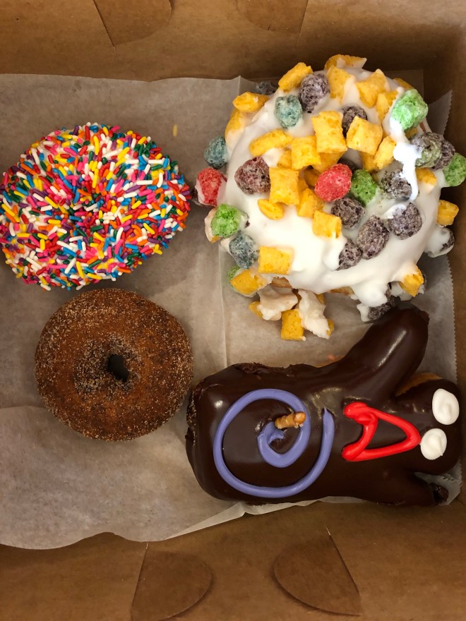 After 25 agonizing minutes, we finally made it to the cashier and ordered four donuts-Mexican chocolate, rainbow sprinkled, Captain Crunch, and the Voodoo Daddy (a donut shaped like a voodoo doll with chocolate frosting and jelly inside with a thin pretzel stick jabbed in its gut-nice!).