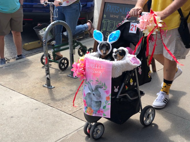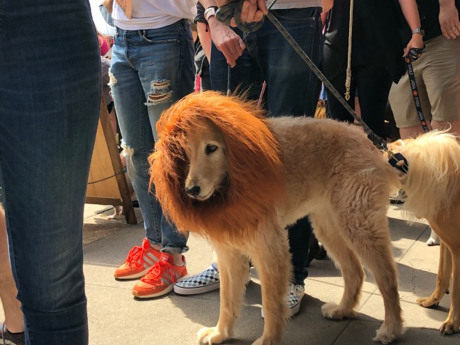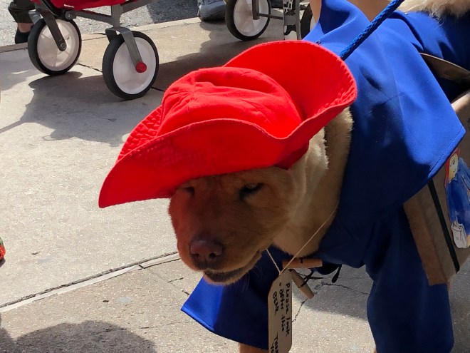Upon exiting one of the stores we heard what sounded like a marching band and turned to see two giant bunnies marching down the sidewalk with the band following and a plethora of dogs, many decked out in costumes with coordinated owners. There was a chow dressed as Paddington bear, a bulldog as Slash from Guns N’ Roses, a golden retriever as a lion, a Fench bulldog as Superman and the best of all was the cart with a pair of chihuahuas dressed as WWF wrestlers and their matching owner, oh and miniature horses in costume as well-too funny!