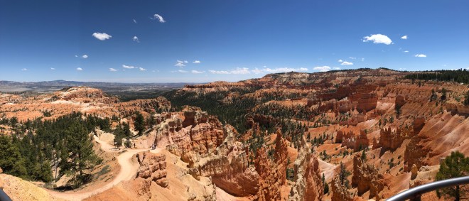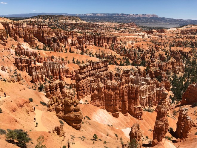 As we approached the entrance to Bryce National Park, we encountered what we feared would set the tone for our trip-long lines, hordes of people and little solace. The car line was ten deep in four lanes across but I moved to the far right where I saw a ranger who appeared to be letting cars through and I was hoping that our annual pass would do the trick-bingo! We were waved right through. But a minute later we encountered the next back up at the parking lot of the visitor center. I told Jenny and Billy to hop out and I would just keep driving in circles until they were done but a few minutes later, Bingo! I got a front row spot-lucky us!