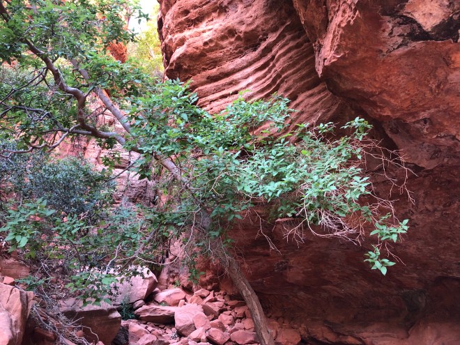 The trail was certainly steeper than we had anticipated but as we neared the 3/4 mile point, we came upon the first pool. We pretty much had the place to ourselves and what a treat that was. The pool is fed from a spring that cascades down from the overhanging cliff above. The trail actually winds behind the waterfall as it plunged to the pool below. There was a decent stream of water today and one can only imagine how it might look with a high spring runoff. It’s hard to believe that you are actually in the midst of a desert when admiring scenes such as these.