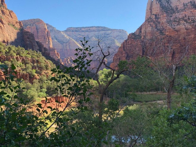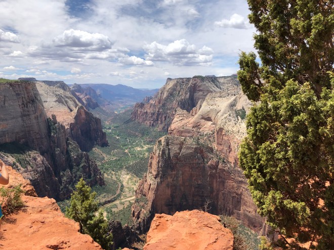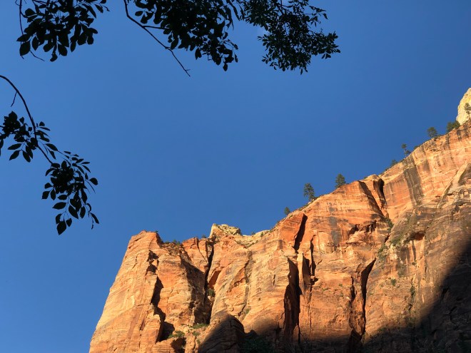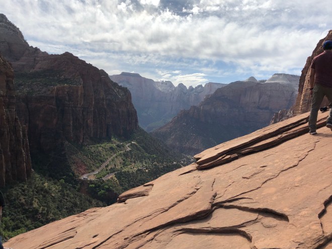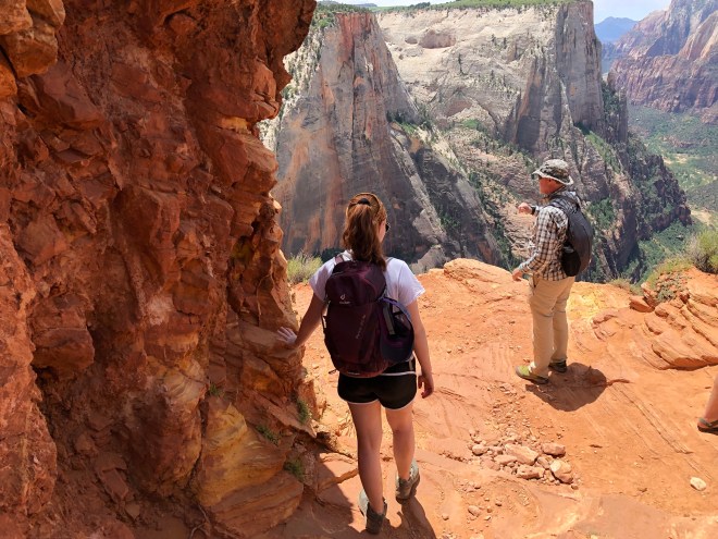 From where we stood on top of Observation Point, we looked down on the famed Angel’s Landing. We could see the lines of hikers backed up waiting for their turn to cross the spine of the rock, holding on to nothing but a chain. I was much happier with our decision from where we were perched.