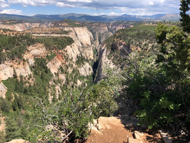 As we emerged from the trees, all of Zion Canyon lay in front of us…wow! We hadn’t actually seen any of this part yet (the entire main canyon of the national park), so to see it from 2500 feet above was mesmerizing. The grandness of it all, with its imposing sheer white, black and rust rock walls was magnificent.