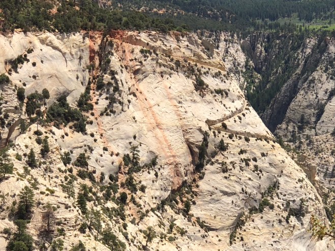 We found a nice place in the shade, away from the precipice that was bringing nausea on watching all the people standing right on the edge of it, and settled in. We were enjoying the moment, munching away on our vegetarian sandwiches when Jenny suddenly says, “Oh mom,” in this tone that you know means there is something that she knows that I am not gonna like. “What?” I ask trying not to panic too quickly. “Oh mom,” she says again. Now the heart starts racing a bit faster. “What?” I ask again in a more forceful tone. “What is it?” Slowly her hand goes up, out comes her pointer finger and she says, “I think that’s the trail over there,” pointing across the chasm that divided us. I stand and look and see brightly colored shirts moving on a trail that is clearly cut into the mountain with a long steep drop off on the side. I take a deep breath and defiantly say, “There are trees on the side of the trail. I will be Ok. It’s only if it is total exposure that I’d freak out.” “Oh mom,” she says again. “I’ll be Ok,” I assure her again. “Uhm mom, I wasn’t pointing to that part of the trail. I was pointing to the crack in the rock.” “What do you mean, the crack in the rock? How can there be a trail in the crack of a rock?” Looking even harder all I see is a sheer rock face. “You see that crack over there? Look at it and just below that to the right. You see that V carved into the rock? I think that’s the trail,” Jenny says, almost afraid that she’s right. In total disbelief, I stare even harder until sure enough, I see people moving on it. There isn’t a tree or a bush anywhere. It is literally carved in a zigzag down a sheer rock wall face-nothing but exposure. I sit back down in total silence and finish my sandwich. Then say, “I think I’m gonna vomit.” Jenny offers me a cookie, as though that might fix everything and I say, “Well, I have no choice. I’m just gonna have to suck it up and do it.”