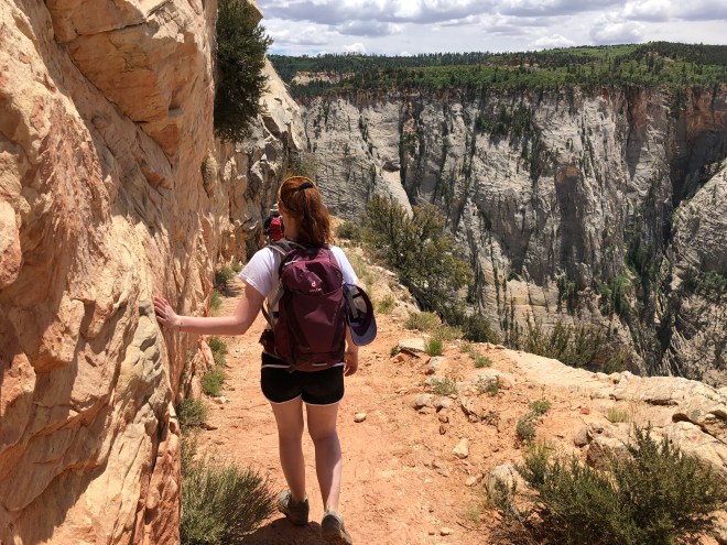 The first part of the trail was as I had suspected, even with the two thousand foot drop offs, I was OK. The trees and bushes provided the barrier I needed. But after that holy cow…was that a different story. The trail was about five feet wide but at some points it was no more than three feet wide. The exposure off the one side was total insanity (though I think Angel’s Landing is even worse). I hung tight to the rock wall, as did Jenny because I warned her she had better if she didn’t want to be embarrassed by me freaking out at her if she got too close to the edge!
