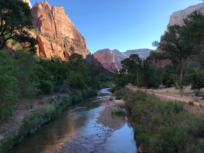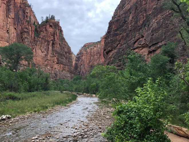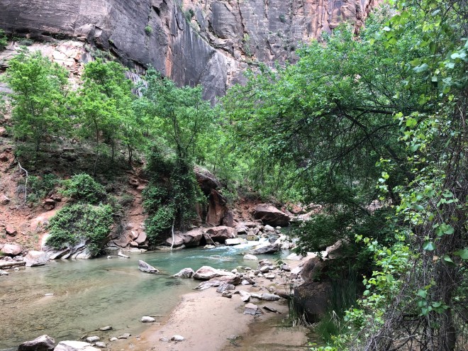 We arrived at the trailhead a little before eight with maybe a dozen other people. The air was cooler than crisp and there was a steady breeze with overcast skies. The first mile of the trail was a paved path that followed along the banks of the beautiful, gin-clear Virgin River. It had a turquoise tint in the deeper spots and frankly reminded us of so many of the wild rivers we had seen in Patagonia. Along the sides of the trails, were hanging gardens of ferns and wildflowers with very small springs erupting from the rock above.