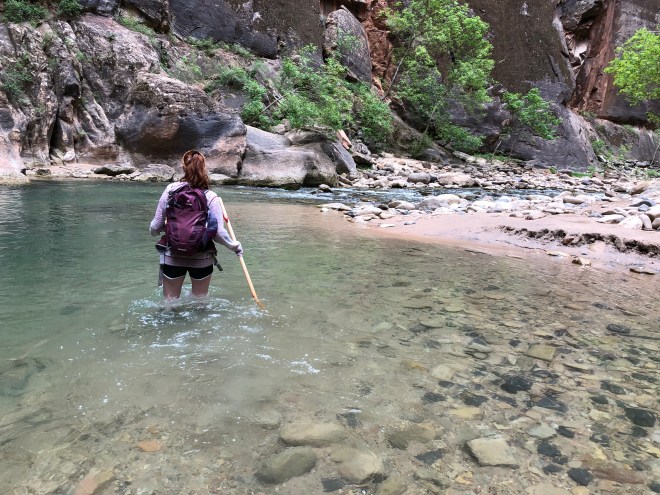 This morning was an early call, we planned to be out the door with bags packed by 7:00 AM. We were driving to Zion Lodge where we would spend the night tonight and because of that, we were able to park our car there and pick up the shuttle from there to the trailhead-a huge time savings! Our destination for the day was The Narrows, the one thing Jenny had specifically requested to do on this trip. We had picked up the necessary gear yesterday-neoprene socks, water boots and a wading staff. We had received conflicting reports whether or not the special gear was necessary but I had decided, overkill in these situations is always better than underkill.
