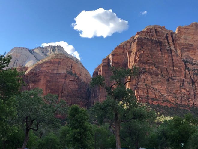 The drive along the beautiful greenish hued Pine Creek, meandered through a lush valley all the while with the beautiful mountains on both sides was lovely. I suggested Billy could take a little cat nap but he responded, “And miss this. No way!” As we began to drop down into Zion, the soaring white and red rock mountains began to appear-what an amazing view. The rock looks like giant rippled sand dunes in varying shade of grey, white, pink and red that have been frozen hard over time.
