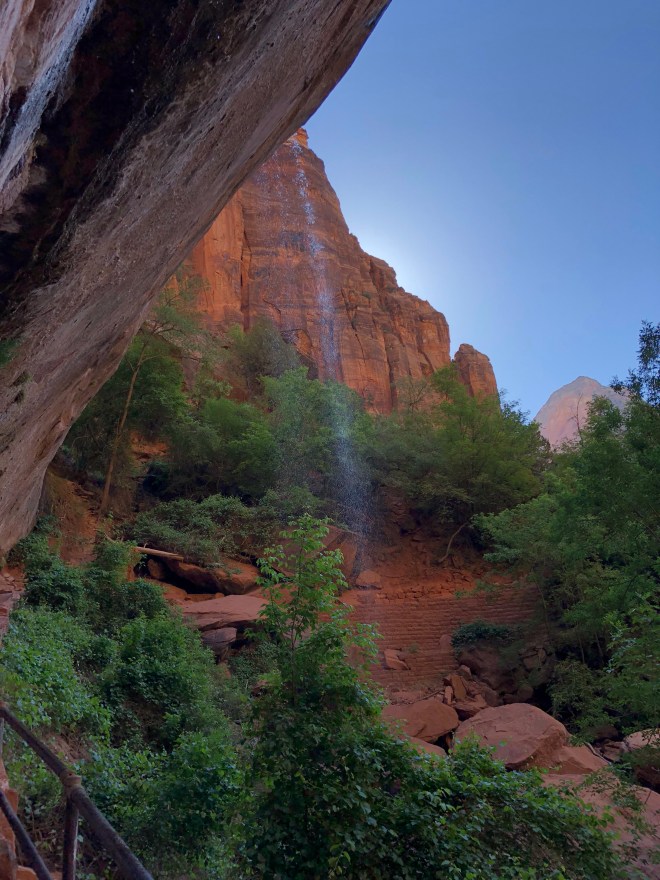 We hit the trailhead across from the lodge and quickly began a steady ascent. The views as we climbed were picturesque-we looked out to Angel’s Landing (we could already see the people on top and it was only 8:00 AM) and Observation Point, as well as the trail we came down on. We were laughing that if someone had pointed up to the top of Observation Point and then told us we were going to hike down from there in under two hours, we would have thought them crazy!