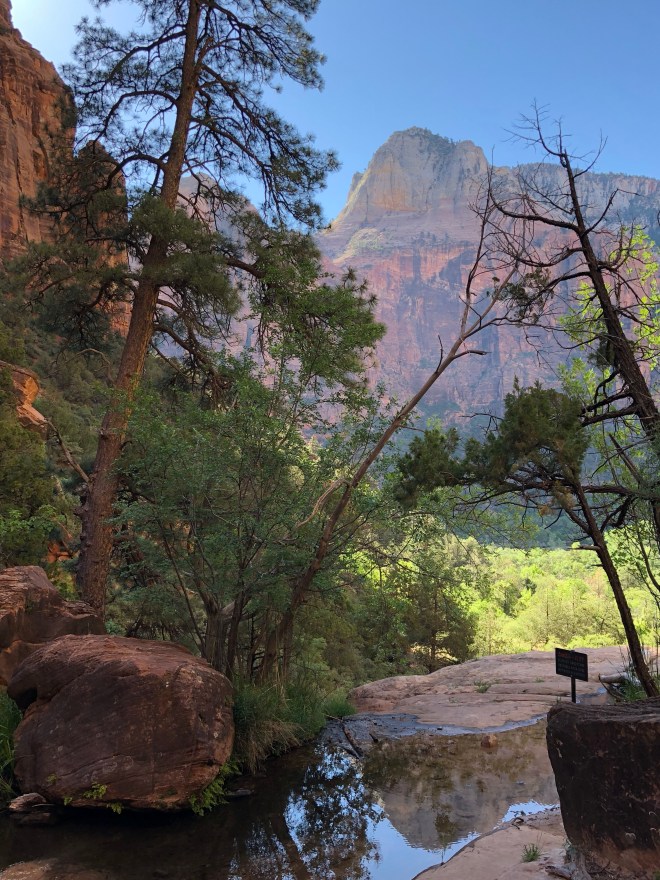 The drive up to the trailhead was a repeat of yesterday’s drive in, only in the opposite direction and only I wasn’t driving this time so I got the wonderful perspective of being a passenger. It was insane the lines we past for people to get on the shuttle to take them in the park (we heard later the lines were up to two hours long), so I was very thankful I had planned the hike this way.