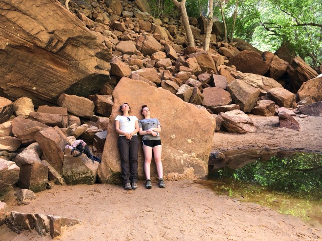 So, on to the upper pool we went but now the trail turned to mostly sand and there was no more shade to be had. We quickly heated up as we continued to hoof it up hill as we recognized our time was beginning to run thin. We made it to the top pool which was sitting directly at the base of an enormous rock wall and though was not quite as spectacular as we had hoped, it was serene nonetheless and we were the only ones there! Jenny spied a couple of frogs sunning themselves on the face of a rock which was entertaining to watch as we cooled ourselves in the shade for a short time.