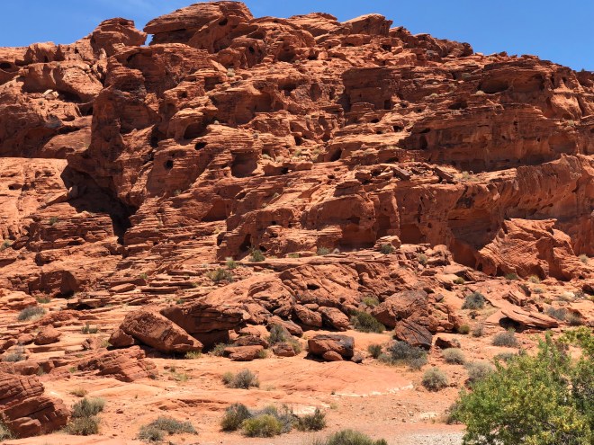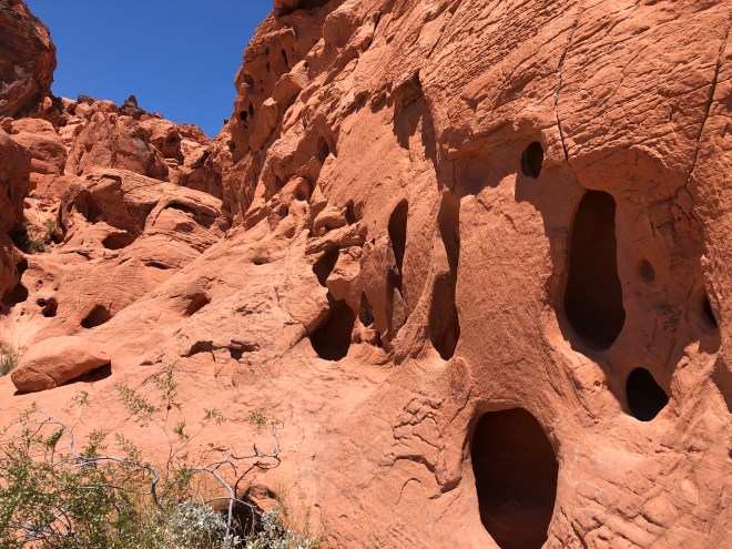 Having just spent four days in some of the most scenic and breathtaking red rock country anywhere, we knew Valley of Fire would not even be able to compare but it wouldn’t be fair to hold it to such judgement. Instead we found the uniqueness in its simpler, less formal formations. The rock reminded me of when I was a child at the beach, building sandcastles and after using a cup to build my castle walls, I would then take wet sand and dribble it on top to form the turrets. The red rock here was brilliant in color containing lots of small holes and caves which had been carved into it by the forces of wind and rain. From a far, Jenny said, they looked like cliff dwellings, but on a smaller scale-she was certainly correct. The hills had softer features, character if you will, that was neither grand nor majestic but intriguing instead. The really wild thing was the rock looked as though it had been plopped down with no rhyme or reason on this otherwise flat desert area.