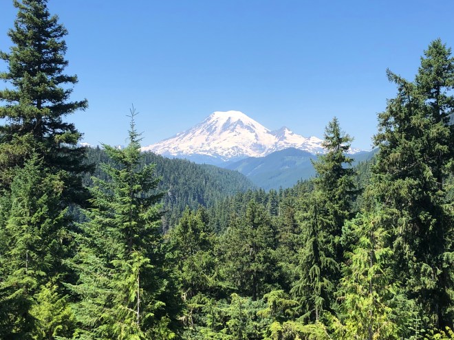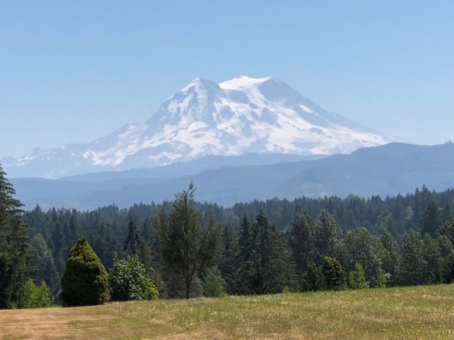 Mt Rainier is there right off the little bumps in the green trees in the distance.