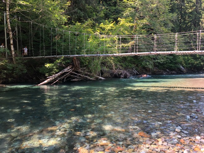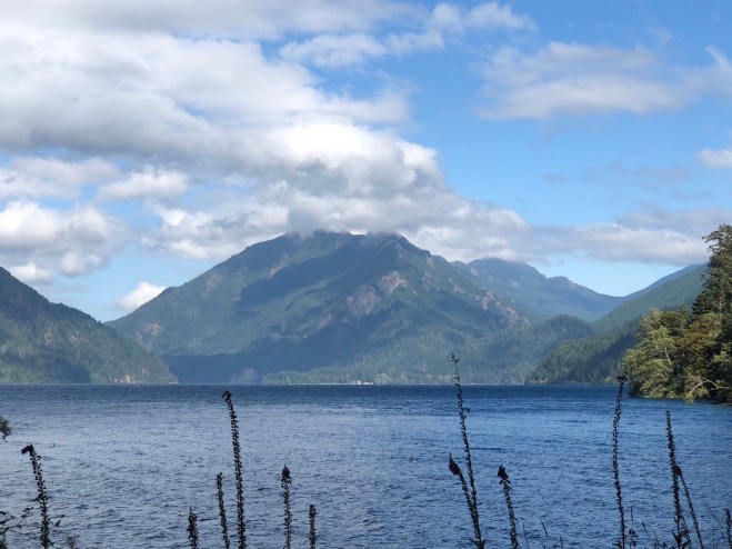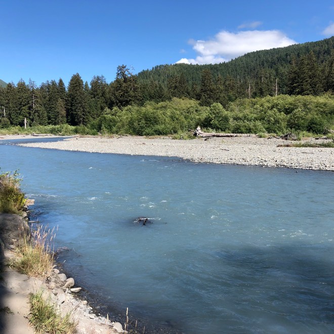 Our destination today was yet another national park on the farthest side of Washington-Olympic. The drive out of the Cascades was beautiful as we passed the now milky green Nisqually River (in comparison to yesterday’s coffee color) as it emptied into Alder Lake, a beautiful tree lined lake that mimicked the color of the Patagonia glacial lakes.