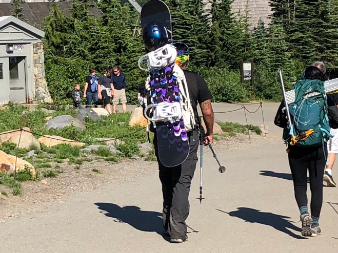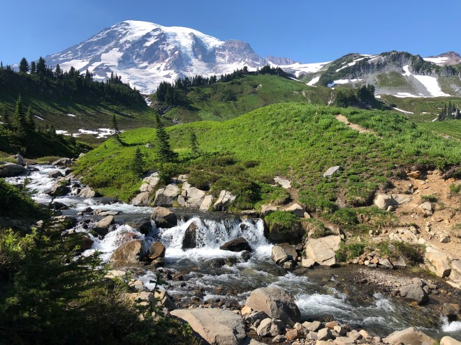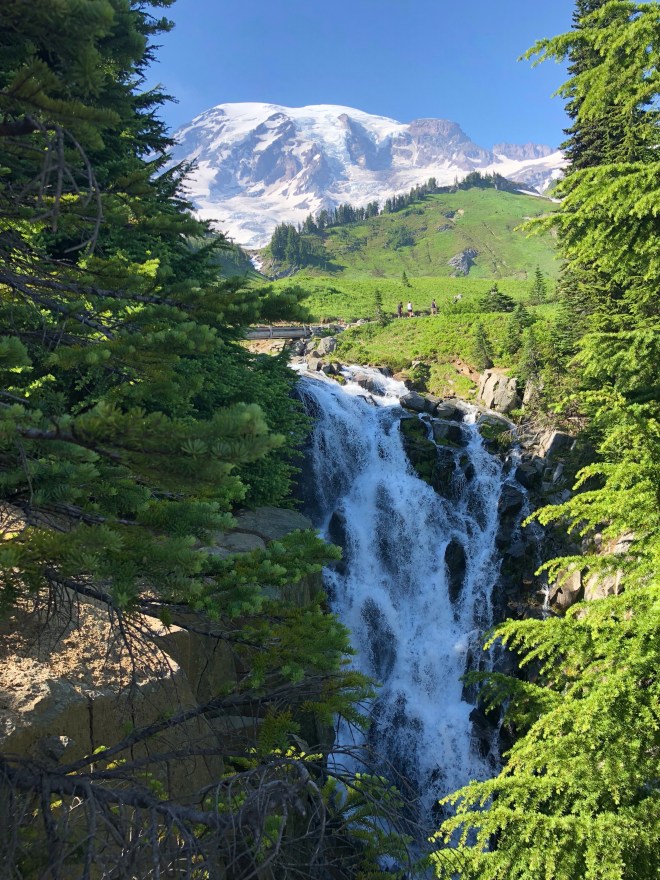 Our first hike was a one mile roundtrip to Myrtle Falls-an uphill hike on a paved path with total exposure and temps still well above 80, but it was short so we knew it would be fine. The views of not only Mt Rainier but the surrounding mountains got even more dramatic as we climbed.