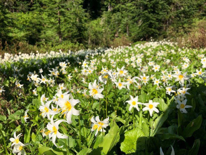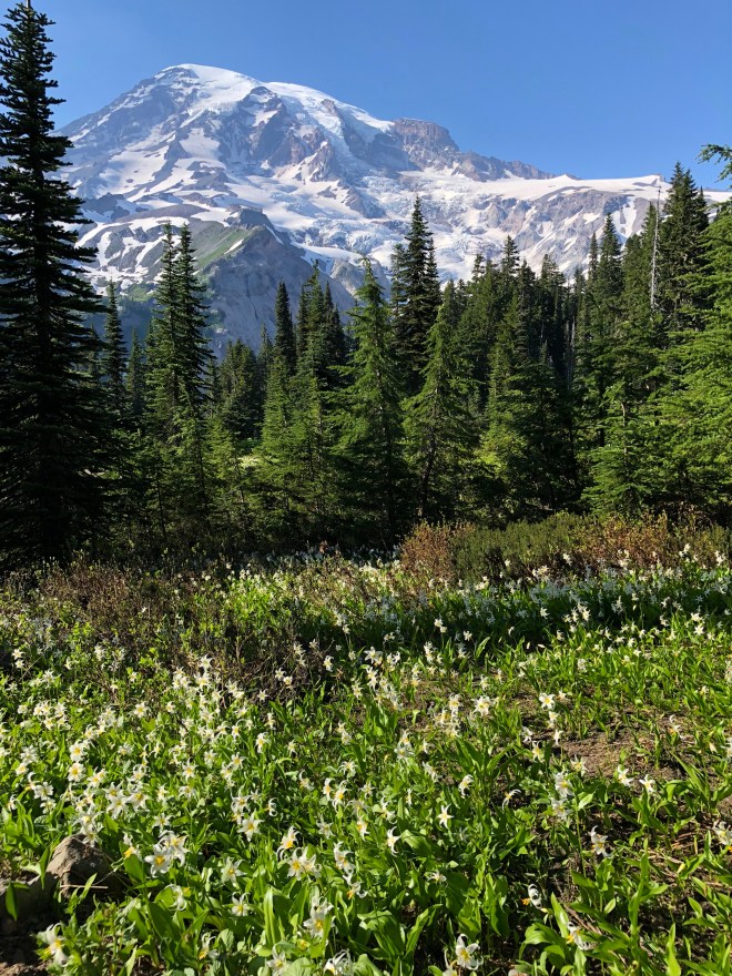 Our second hike was a 1 1/2 mile hike with a 200 foot elevation gain out to a viewpoint that gives you the full view of Nisqually Glacier. The meadows here were alive with thousands of dainty white avalanche lilies dancing in the breeze.