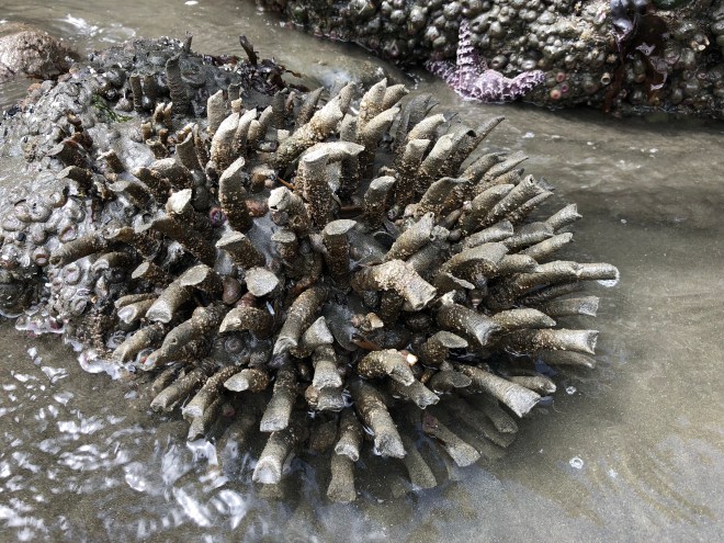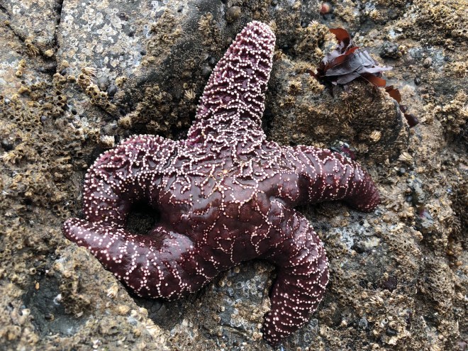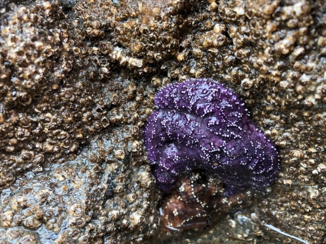 There were thousands upon thousands of sea anemones, hermit crabs, mussels, snails and of course barnacles. The further we walked out into the rocks the more sea stars we spotted-besides the orange and ochre ones, we saw purple and maroon ones, they were literally everywhere. We laughed and wondered what those people from last night were talking about and what beach they had gone to because you would have to be blind to not have spotted one.