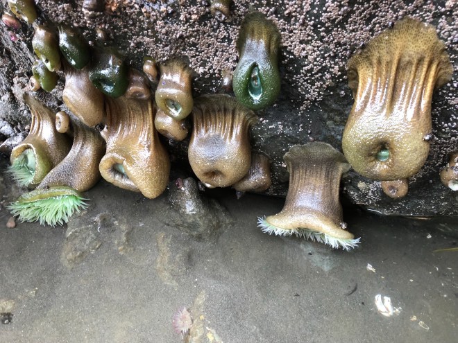 These are by far the best tide pools we have ever seen. I felt like we were looking at the touch tanks at Long Beach Aquarium. The vibrant colors of the anemones, sea stars and shells were unbelievable. I have never seen anemones that were fuchsia lined, and the neon greens were as brilliant as ever. There were some so huge they sagged under their own weight-so we dubbed these ones the “saggy boobs!”