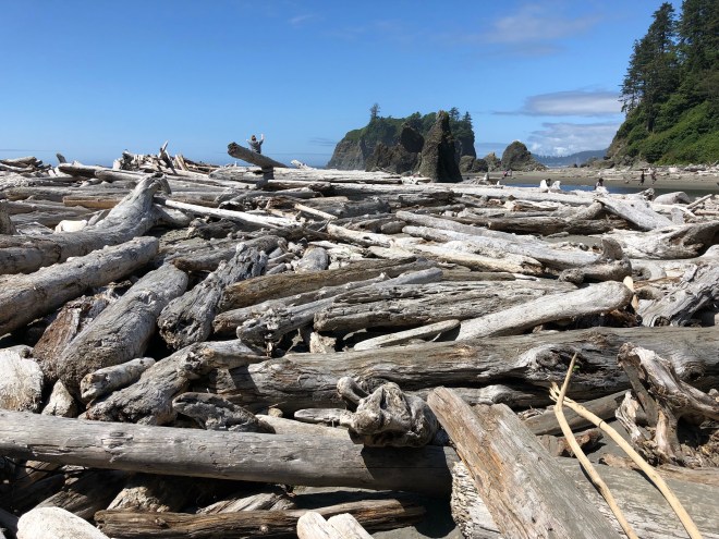 Upon arrival at Ruby Beach, there were plenty of cars but we found a spot and set out down the path to the beach. Our first views showed a beautiful rugged coast with a wide exposed dark sand beach, leading up to a stretch of cobbled river rocks, and then a substantial stretch of drift logs at the base of the headlands. There were numerous stacks scattered and with the low tide, we could see the rock formations that created the numerous tide pools.