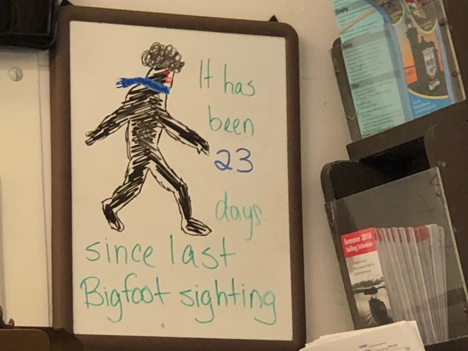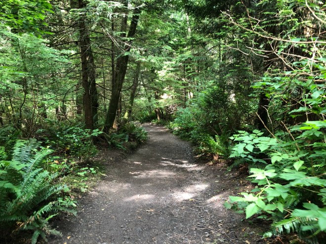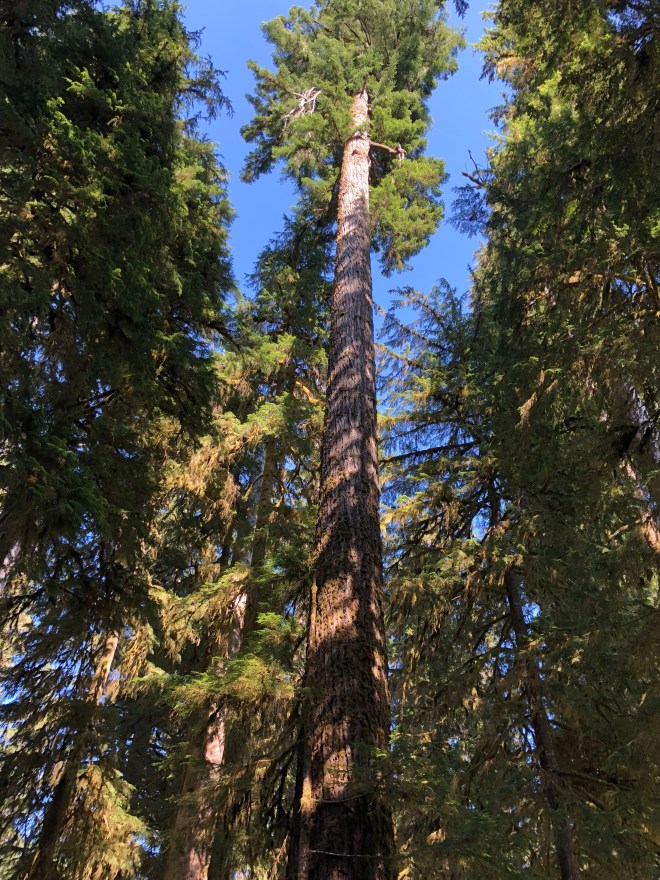 We were happy that the terrain was a bit more open as we felt like it would aid us in our search for a banana slug. When we entered the park gate here, the rangers told us two things. First, it had been so dry that the slugs are hard to come by. He had seen one on the trail the day before and when I inquired about what trail and where to look for them, he informed me it was hanging out on fresh bear scat-apparently they like the moisture. Opting to avoid any fresh bear scat, we decided we would search any other areas that we felt looked moist enough to entice a slug its way. The second thing he told us was how long it had been since there had been a Sasquatch sighting. The Pacific Northwest is home to Big Foot, in case you didn’t know (and I think flying purple elephants and unicorns too)!