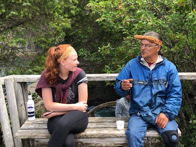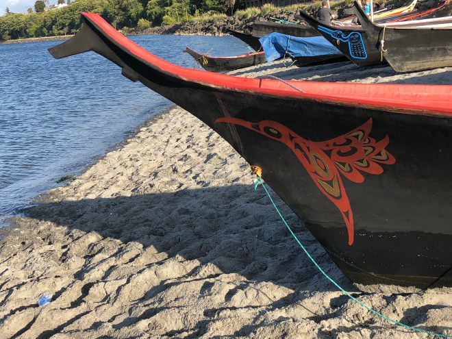 Culturally our day was very intriguing; it certainly gave us lots to talk about and to think about. At one point Jenny overheard a group of people saying they thought the ceremony was turning into a, “Reprimand of the white man.” Indeed, there was some of that in a few of the exchanges that we heard but I think it was misconstrued as two of the young girls welcoming the canoes, speaking their native language, were blond haired and blue eyed, clearly a descendant of the “white man” somewhere along the line and probably closer to what Spencer was talking about when speaking of the loss of pure blood lines.
