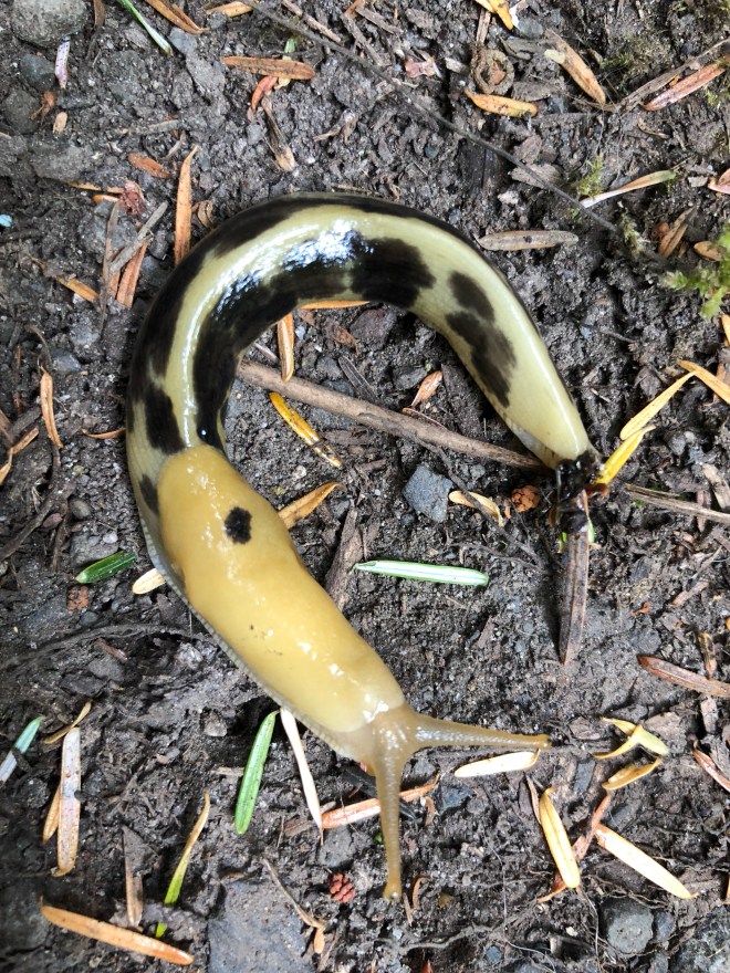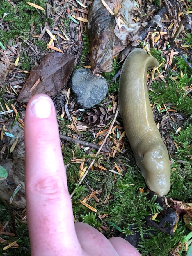 As it turned out, we spotted three more along the trail on our walk up but none were as brilliant as the one the guy spotted. But, we finally found the elusive banana slug, some almost as big as Jenny’s finger-score!