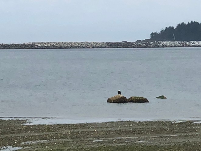 We stopped back in Neah Bay for lunch at Calvin’s Crab House except we chose not to have crab, too much work, so I stepped out of my box and had fried halibut and chips and Jenny had a Caesar Salad with fried chicken. The halibut, though battered and fried, was absolutely off the charts delicious. We sat on picnic tables, overlooking the beautiful Neah Bay, watching a bald eagle that was sitting on a rock in the water-just perfect.