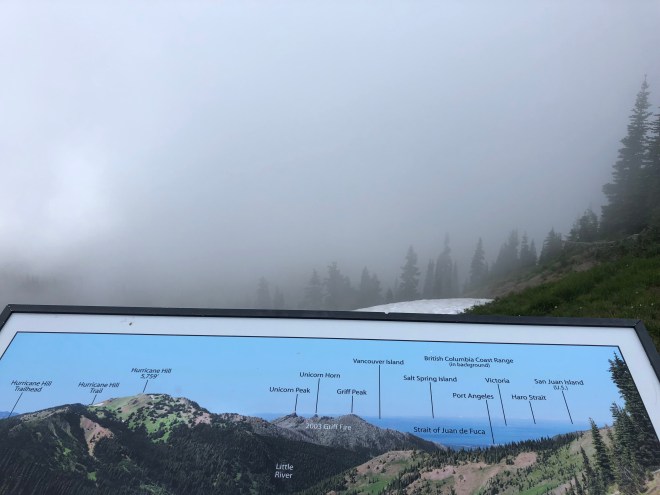 We took a walk on the few loop trails that there were, even though the clouds were so thick on that side. We headed up to the overlook and looked out at a wall of white, but there was a sign there showing us what we would be looking at if it was clear.