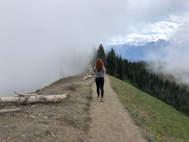While we saw nothing looking out towards the ocean, the mountains were still in view, and hiking with the clouds rolling over the spine of the trail was a surreal experience. I would have hated to get completely socked in because the trail was only about five feet wide with plummeting sides.
