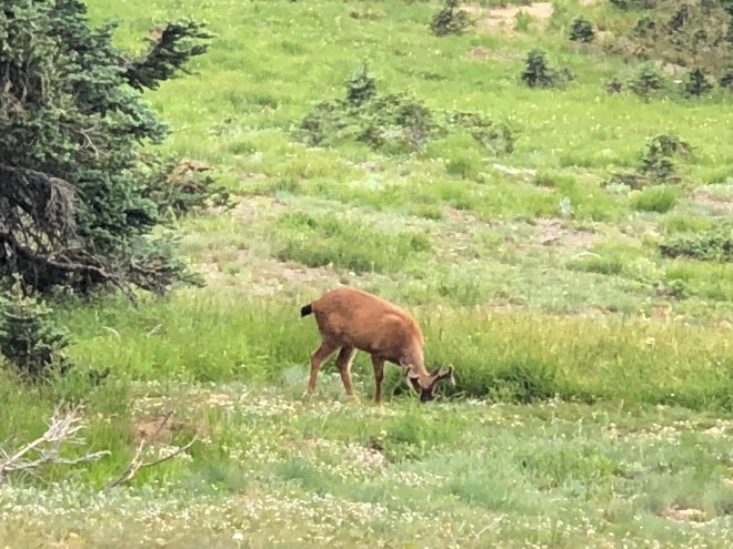 On our way down, out of the clouds we spotted a bunch of blacktail deer, including a spotted fawn and a few bucks with decent racks, grazing in the meadow. They seemed to have little fear of us humans as well as the marmot that was hanging out. You remember what Jenny said, that if you want to go someplace beautiful, go to where the marmots are-well she was right. It was really spectacular up top and we decided that we enjoyed the clouds, it was a different experience and added something to the hike.