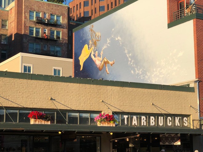On our planned drive into Seattle, we noticed that there was some serious traffic building so we opted to get off and take a parallel route through the countryside. There was a Starbucks at the exit and of course we stopped to grab a drink for the road. Turned out it was the same one we had stopped at yesterday on our way up to Bellingham where we had had a funny conversation with Robby, the barista. He, like just about every other restaurant worker, asked us what we were up to. When we told him we were on our way to Bellingham he said,