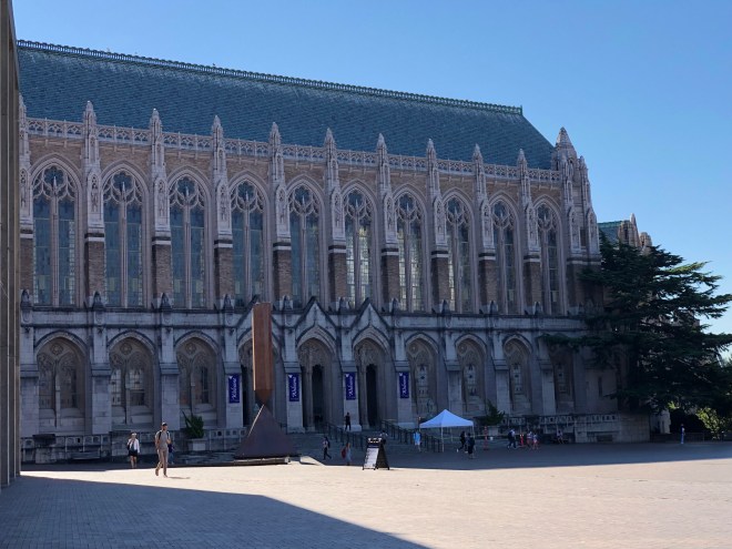 This morning was our tour of the University of Washington (UW), not necessarily a college Jenny had thought of but one I thought would be good to take a look at. It is a large institution both in size (bigger than Disneyland) and student body (almost 30,000) but it has an excellent reputation as a research institute, receiving 1.3 billion in research funds-the most of any US public university and is second in the nation only to Hopkins.