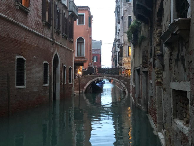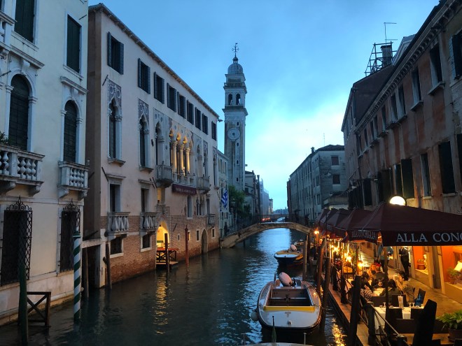 After dinner, we enjoyed strolling through the narrow streets of Venice, now that the cruise ship passengers had returned to their vessels. We rambled over bridges while a light mist fell, and dusk turned into night with the amber glow of the trattoria lights reflecting off the canals; it lent a different feel to the never ending stream of people we had seen from our balcony earlier in the day. We let Jenny lead the way, all the while knowing we were getting lost in the labyrinth of alleyways that make up Venice’s streets. The evening was magical, in a pleasantly surprising way, as we were all a bit skeptical of whether we would enjoy Venice or not; so far so good!