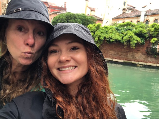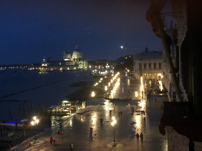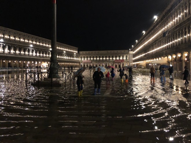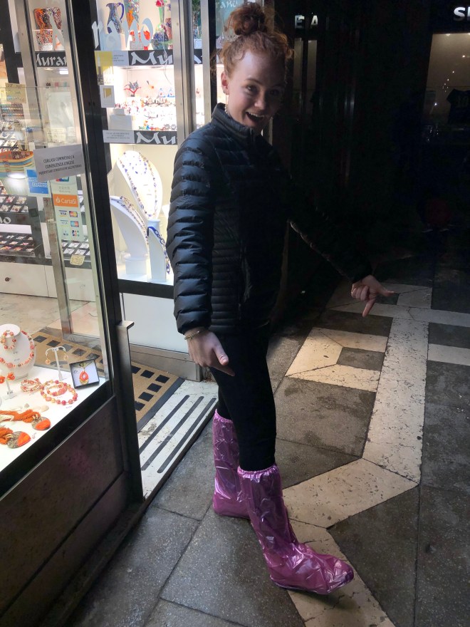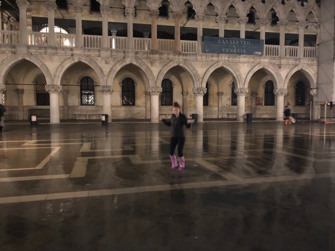 After our delightful dinner, and the joyful conversation in Spanish with the table next to us, an adorable couple from Miami via Venezuela, we walked out to find Saint Mark’s Square flooded. Jenny said she would take her shoes off to walk through but with all the pigeon poop that is all over the square and now in the water, there was no way I was going to let her do that! So I bought her a pair of knee high shoe covers to which she was thrilled as she danced around in the square, stomping in the water, merrily splashing away. It was a perfectly fun evening to end our stay in enchanting Venice!