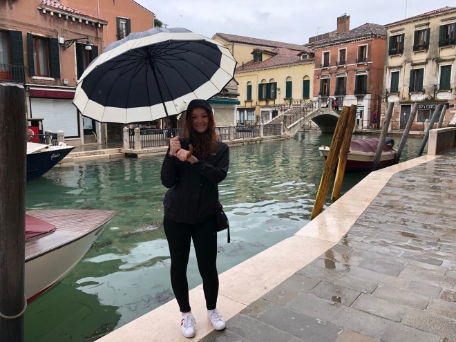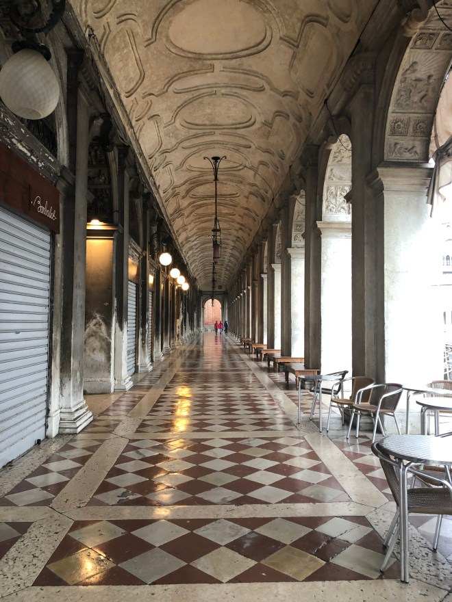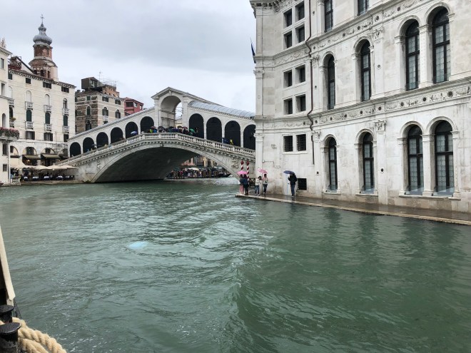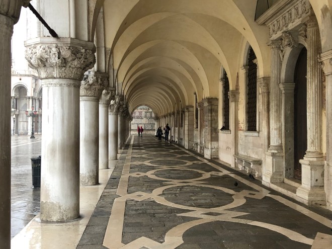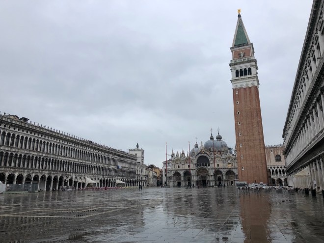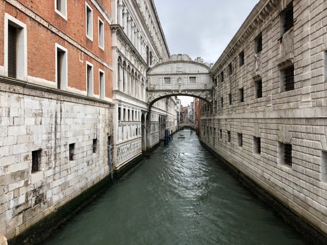 This morning I woke up at 7:30 and flew out of bed. I wanted to get out before thousands of cruisers descended on Venice to try and enjoy it in the tranquility I was sure it possessed. My crew wasn’t budging so I set off on my own. I took a quick glance out the window and it appeared only overcast so I left my raincoat and headed out. By the time I reached the lobby, the skies had opened up and it was bucketing. I grabbed an umbrella from the hotel and made my way to Plazza San Marco, which was just a few doors down. I passed by the famous Bridge of Sighs, so named as the prisoners would cross it and be able to take one last glance at the beautiful San Giorgio Maggiore, for which they would sigh knowing they would never see it again before being executed-so romantic, right?