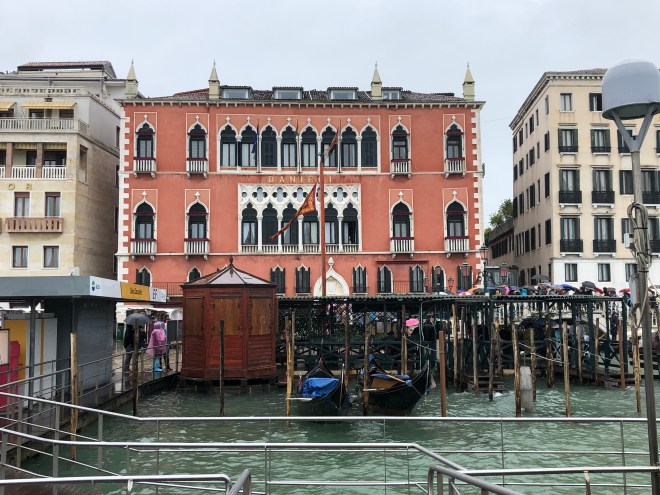 Arrival into Marco Polo airport after sitting in cramped, hard-as-rock seats, for almost twelve hours was a bit of a bummer as it was raining. We had seen the forecast before we departed so while we were not surprised, we were not prepared to have our raincoats in our carry on bag because arriving into Venice is like arriving to the islands-deplane directly onto the tarmac. Immigration was the snappiest we have ever encountered anywhere and our bags were already spinning on the carousel when we walked into baggage claim. We were out the door and handing over our prepaid voucher for our speedboat ride from the airport to the door of the Hotel Danieli within 30 minutes of touchdown!