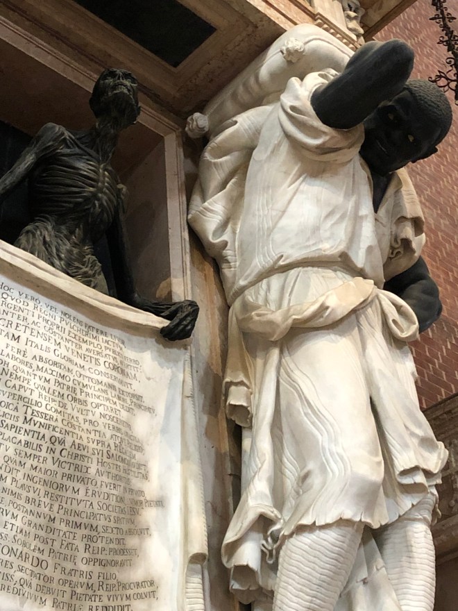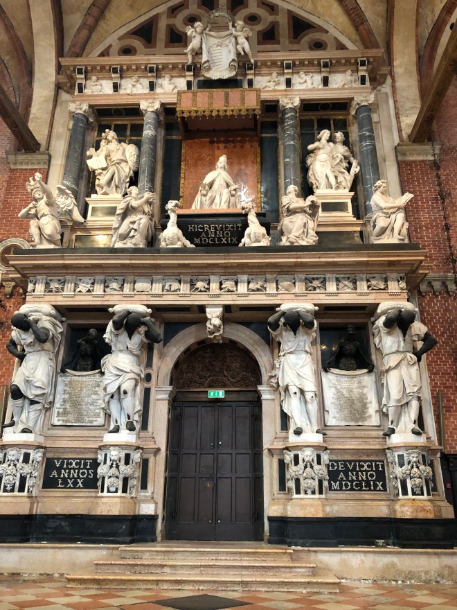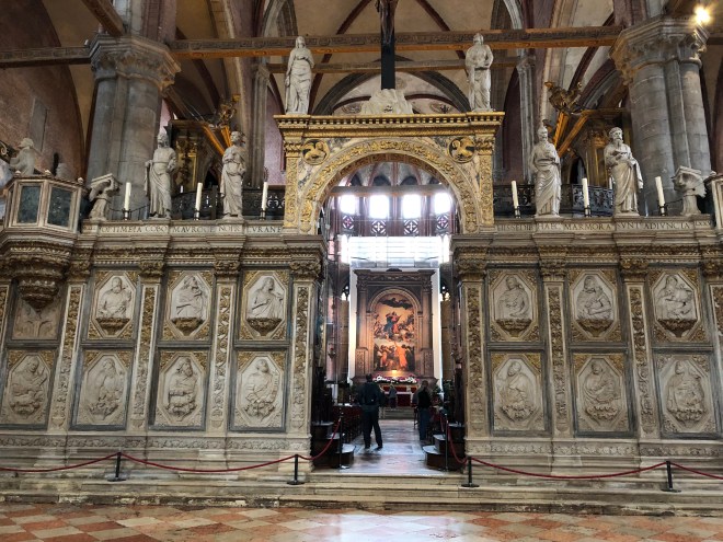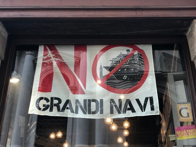 Following our pit stop we thought we would make our way to Basilica Santa Maria Gloriosa dei Frari, a large church built in 1492 that the concierge had recommended seeing. We chose to head there without the aid of the map or GPS and 30 minutes later, ended up right back in Campo Santa Margarita to which we laughed and celebrated with a delicious gelato! We were struck by the number of banners we saw in this area opposing the large cruise ships-clearly we agree with them. While it can be said the cruise ship industry brings money into select hands of the local economy, it destroys the areas authenticity and has far more negative consequences.