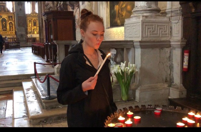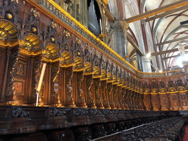 30 minutes later, and a few more dead ends, we reached the basilica. The doors were open so we paid the entrance fee and were immediately wowed by its beauty. It is mammoth in size with soaring ceilings and large monuments built to various people whose names I did not recognize. We enjoyed walking in silence through this sacred place, admiring the works of art and the two large organs that sat on either side of the wooden choir-one can only imagine what it must sound like in there when the organs are being played. We lit more candles before walking out into…fleeting sunshine; perhaps it was a message from those we remembered…